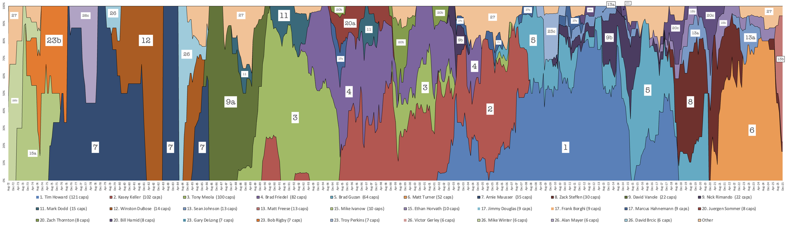 So what are all the goalkeeper eras? It’s hard to concisely say X goalkeeper had such-and-such time as the number one. Even Howard, who had a long career with the national team, wasn’t always the most played goalkeeper, whether due to tough competition from Kasey Keller or stepping away for a one-year hiatus with the national team after the 2014 World Cup. Although there are some clear standouts (Mausser, Vanole, Meola), after that the timeline gets a little blurry until Howard gets the bulk of the time in net.