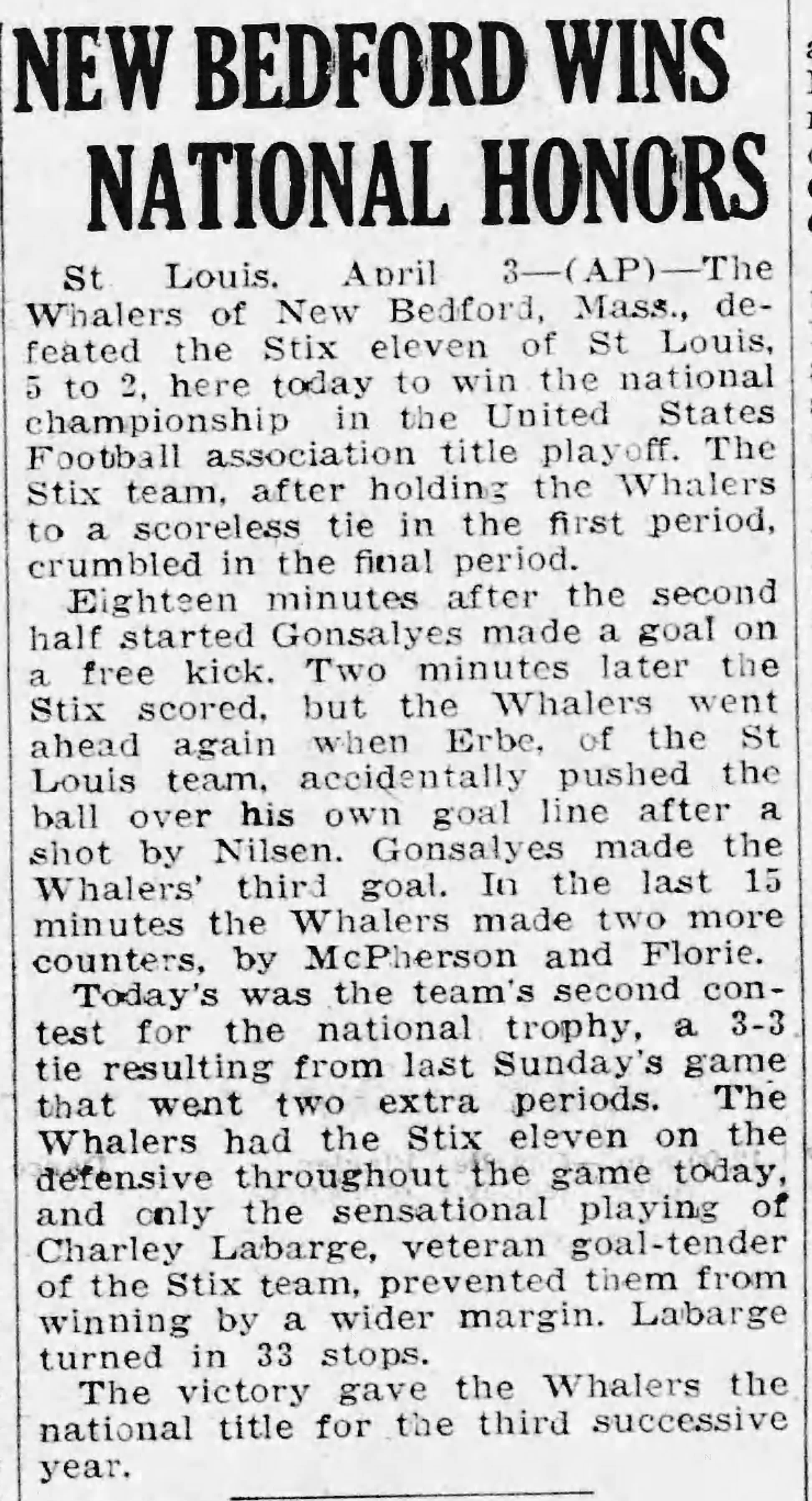The road to capturing the Cup in 1933 was no easy task for LaBarge. Less than a week before the final, LaBarge was released from the club for “the welfare of the club” over financial disputes but was oddly reinstated just days later. LaBarge was tight-lipped about the specifics of the affair and set his sights on finally capturing the elusive trophy. The first of the two-legged was a shutout by LaBarge but the St. Louis goalkeeper received a concussion from a blow to the head, leaving his status for the second match in question. LaBarge was ultimately cleared to play by doctors, conceding only one goal against the strong ASL representative, the New York Americans, and finally winning the National Challenge Cup.